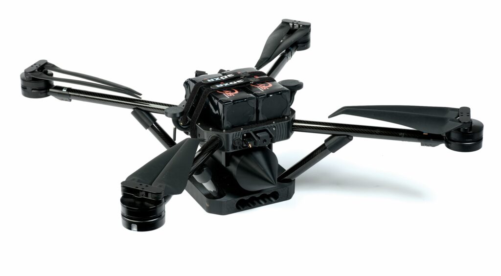 “It folds out of the bag and can be flight-ready in 90 seconds, and we’ve chosen to integrate a very high-end ISR payload as standard, which features a 40X optical zoom EO camera and a 6X optical zoom thermal camera in a 3-axis gimbal. With that thermal camera, it can confirm sight of people at about 1–2 km away, and the EO camera can recognise vehicles from 5 km or people from 3 km.”